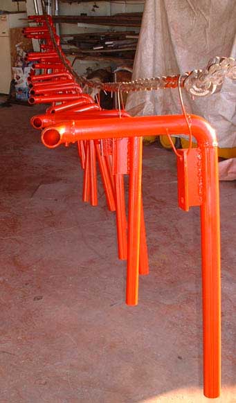 The material used in the construction of Jewell Windmills is ASTM A526 grade sheet steel. The Ultimate Tensile strength ranges from 42,000 - 54,000 psi. The blades and tail vane is constructed from 16 gage (0.059” thick) steel, twice as thick as the 20 gage (0.0359”) used by the original windmills! The blades actually increase in bending strength by a factor of 4 when the thickness doubles! This is definitely advantageous in a hailstorm! The framework utilizes 11 gage (0.1196”) steel and most other components are 14 gage (0.0747”).