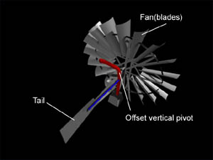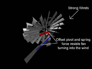 High wind speeds create force on blades that rotates the fan about a virtual axis out of incoming wind. |